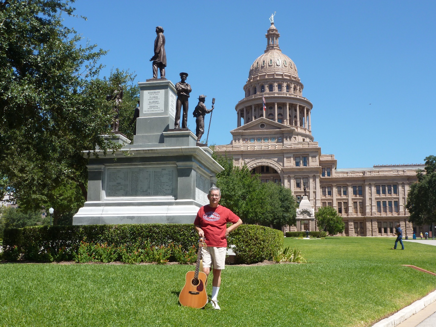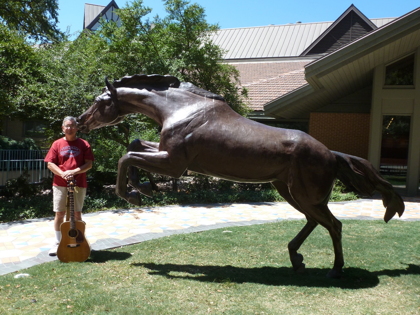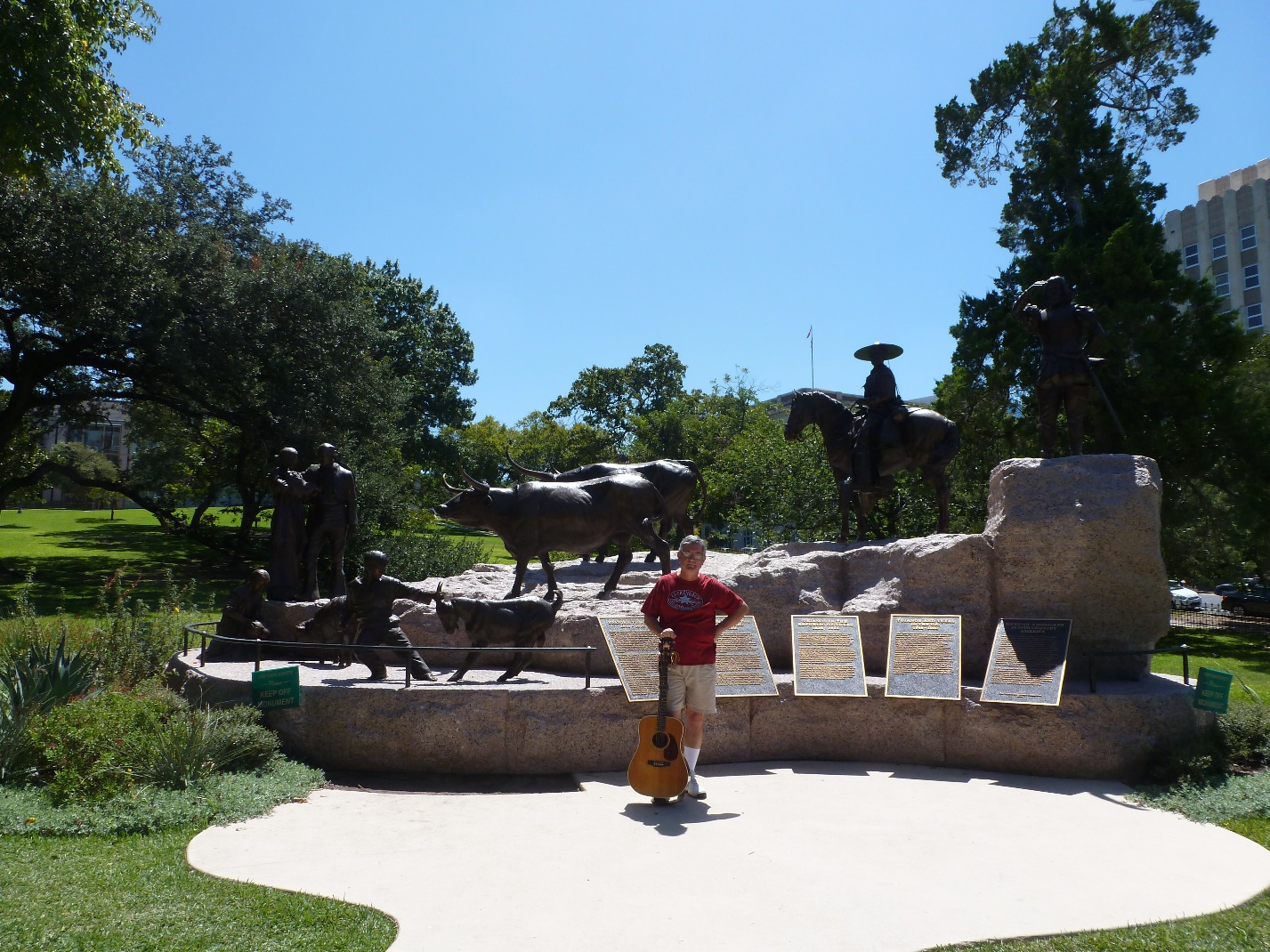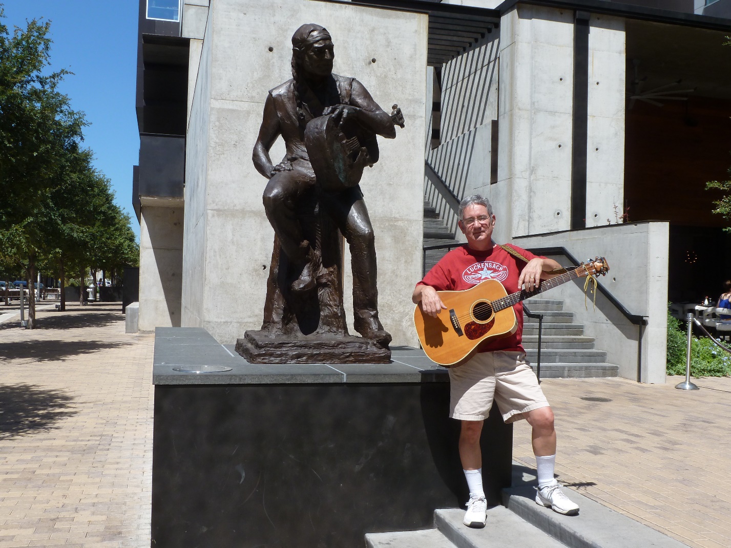 Marty and I are at the Willie Nelson statue in downtown Austin. Willie’s guitar, Trigger, has always been Marty’s hero because he can still play beautiful music even with that extra hole in his side that Willie wore through. By the way, Trigger and Marty just happen to be distant relatives.